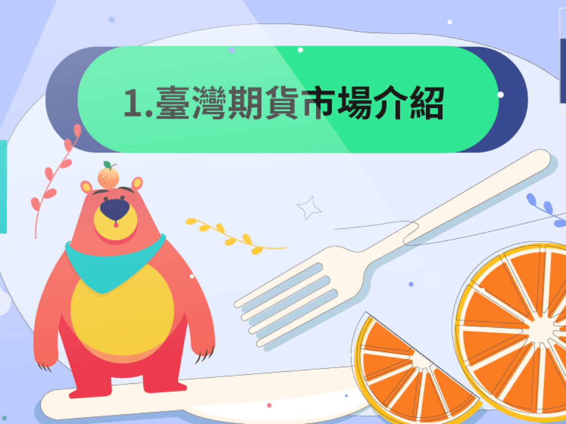 1.1 期交所發展歷史 (02:49) History of Taiwan Futures Exchange 1.2 期貨市場參與者 (00:36) Market Participants 1.3 四大熱門商品 (00:38) TAIFEX Four Leading Products